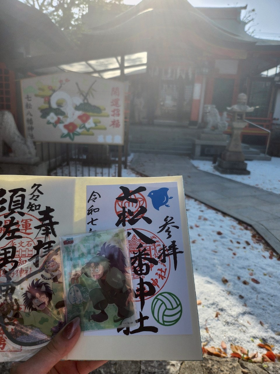 次は、七松八幡神社。七松小平太というキャラがバレーボールが得意なので御朱印にもバレーボールが刻まれています。年始には七松小平太の絵馬が発売されたりと聖地として力も入っています!ファンとしてとても嬉しい限り✨(インフルでゲットできなかったけど😑)4月とはいえどかなり暑く1日中チャリンコと漕いでいたので、神社で少し涼み一旦ホテルへ。