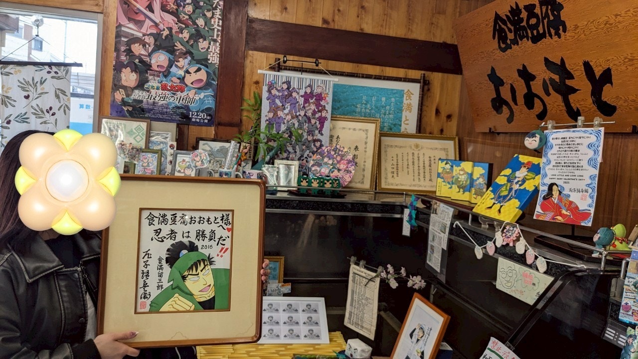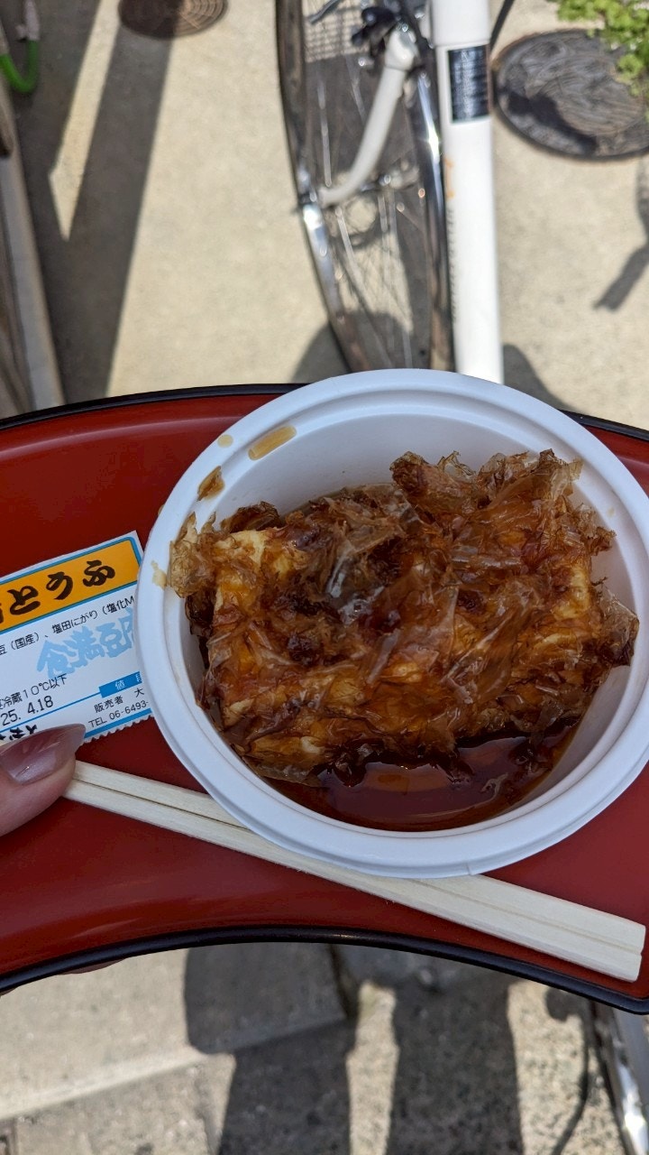 続いて向かったのは、「食満とうふおおもと」。ここは忍たまに出てくる食満留三郎が名付けられた食満という場所にあります。(忍たま内での豆腐キャラといえば久々知ですが笑)この日は一日中自転車で尼崎市内を爆走していたので、ここに着く頃にはへとへとのお腹ぺこぺこ。お目当てだった豆腐ドーナツは人気があり私が言った昼過ぎごろにはもう売り切れになっていました。どうしようと迷っていた矢先、お店のおばちゃんが揚げ出し美味しいよと言ってくださり、食べることに。出された揚げ出し豆腐と一緒におばちゃんが材料名シールをくださり旅のお土産になりました。そして、鰹節と出汁たっぷりの揚げ豆腐が体に沁みエナジーチャージ完了!!あまりにもここの揚げ出し豆腐が美味しかったので、帰り際に絹どうふ一丁と生湯葉を購入しホテルに帰って食べることに笑笑