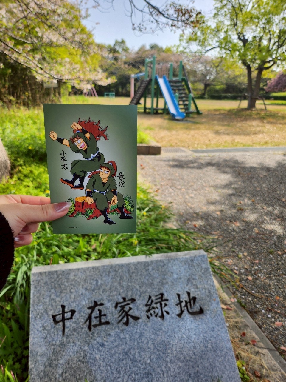 うどんを食べた次に向かったのは中在家緑地。他の聖地と打って変わり公園に来たのですが、平日ということもありとても穏やかな場所でした。桜が新緑の葉に移り変わる葉桜を見つつ小休憩。前日のチャリで体がかなり疲弊していたので二日目はのんびりしております。